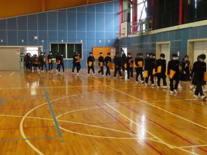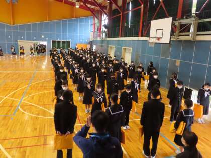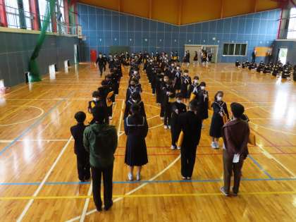 全校生が体育館に入っての全校集会は、1年半以上行ってませんでした。1年生、2年生ともに全校集会で並んだことがありません。3年生は1年生の時以来です。体育館にいっぱいに広がって整列しました。