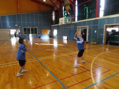 2Aの体育はバレーボールを行っていました。オーバーハンドパスの練習です。手のひらを一杯に開き、指の腹(指紋)の部分で押し出すようにあげていきます。コントロールが難しいですね!