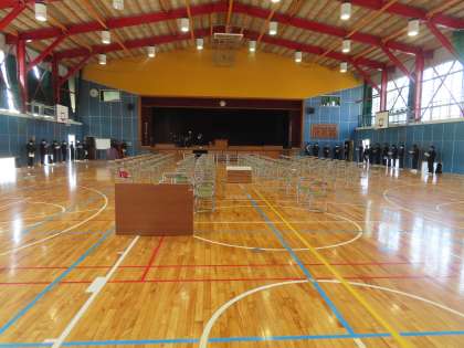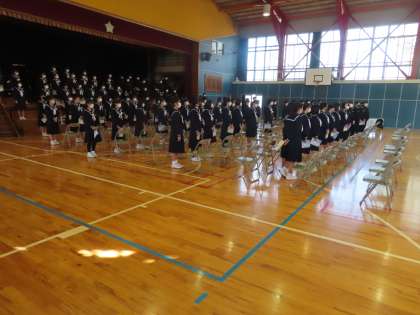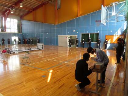 体育館で歌練習を行っています。間隔を開けて密にならないように工夫されています。男子はパート練習を体育館で行います。