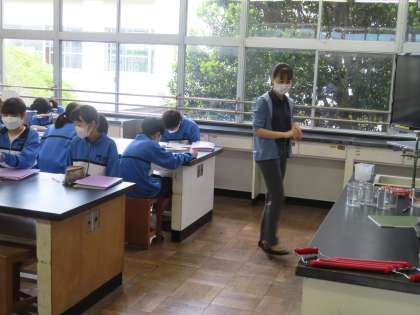 2Cの理科の授業です。氷を水に戻す方法として、「じっくり待つ」方法もありますが、時間がかかるため理科室の器具を使います。ガスバーナーを使って溶かします。まず、久しぶりのガスバーナーの使い方を復習しましょう。