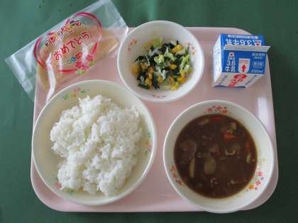 本日は小学1年生がはじめての給食日ということでいっしょにお祝いです。どのメニューもおいしくいただきました。