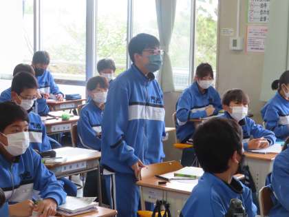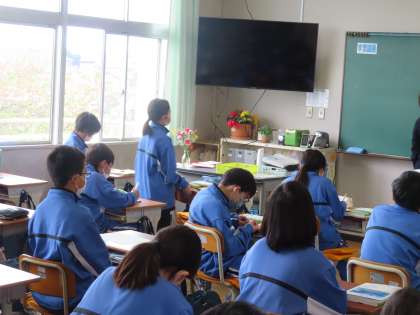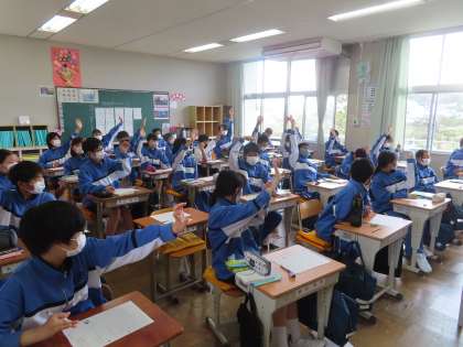 「朝のリレー」という言葉を見て、想像できる言葉をいくつ思いつくかを個人で考えていました。17個考えた生徒が一番です。他の人が考えつかないものを考えた人「一人チャレンジ」と言うそうですが、「びり」「青春」「かっこいい」「優勝」などは一人チャレンジ成功です。とっても楽しそうな授業でした。
