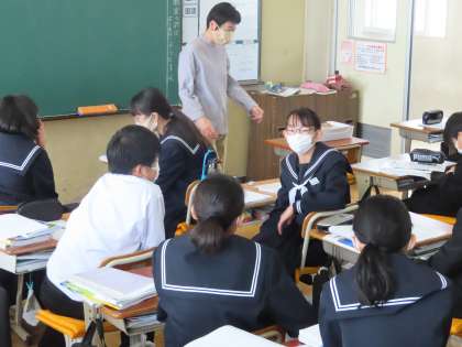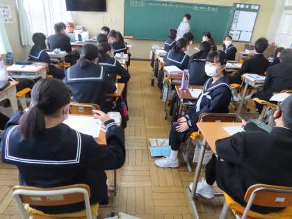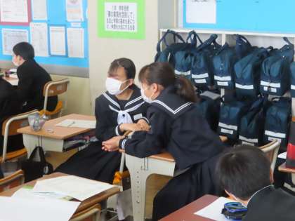 「地球の姿を知る」という授業です。矢後先生の社会です。地球を宇宙から見たらどんなでしょう?色はどんなでしょう?一斉に答えを言います。「青」「白」「緑」この三色が多かったです。衛星写真を見ながら確認していきます。白=雲 青=海 緑=陸と答が出てきました。