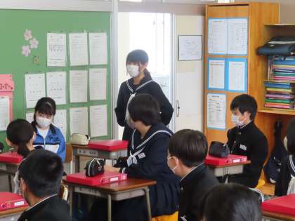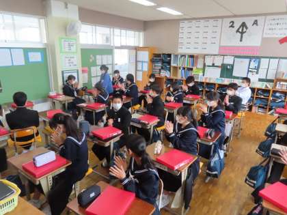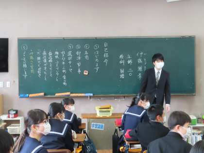 伊藤先生が初めての2年生の授業となるため、伊藤先生に向けて自己紹介をする事にしました。黒板にある内容を入れて話していきます。しっかり発言者を見つめています。拍手もしていました。