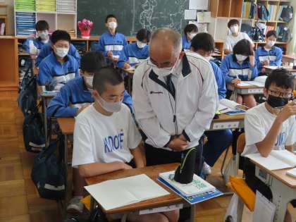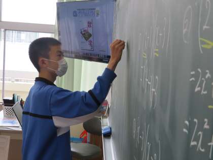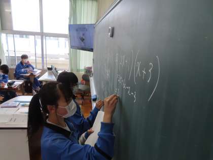 「平方の展開の方法ができるようになる」を課題として授業が進みました。乗法を展開するときの公式に合わせてみます。スムーズに進んでいきます。スラスラ黒板に答を記入していきました。