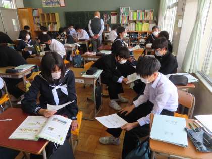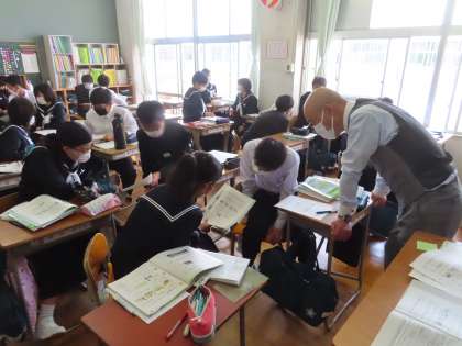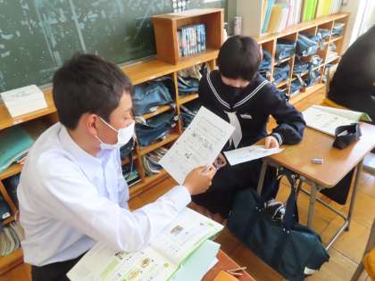 3Aの英語は「受け身の文を使い、身近な事柄について表現できる」を学習課題として授業が行われています。プリントにある項目から質問を出し、返事をする課題に取り組んでいるところです。