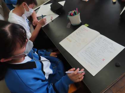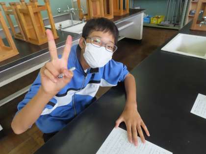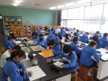2Dの理科は前回やった実験のまとめをしています。実験の内容がしっかり残っているため、考えをまとめてスラスラ記入していきます。実験の時、しっかり見やすくメモをしておくと後からまとめやすいですね。