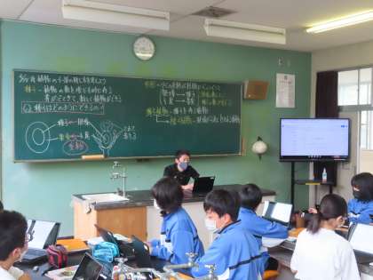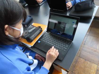 Chromebookを使ってリポートの提出を行っています。「花つくりのレポート」で写真を取り入れてから提出ボタンで「データ」で提出していました。
