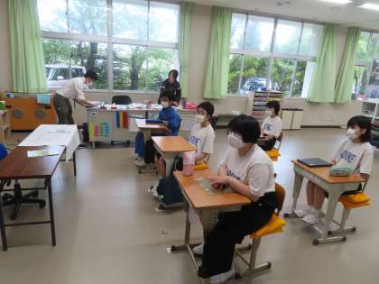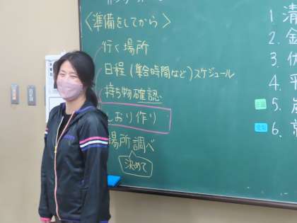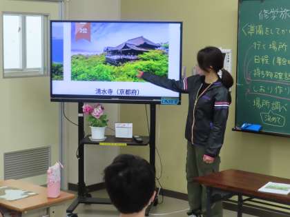 修学旅行について説明と確認していました。クラスコースの確認です。金閣寺、銀閣寺、平等院、清水寺など有名な場所が出てきました。写真をChromebookで検索してモニターに写していました。
