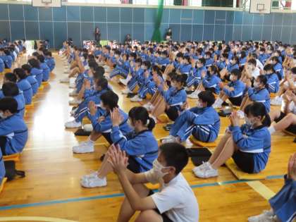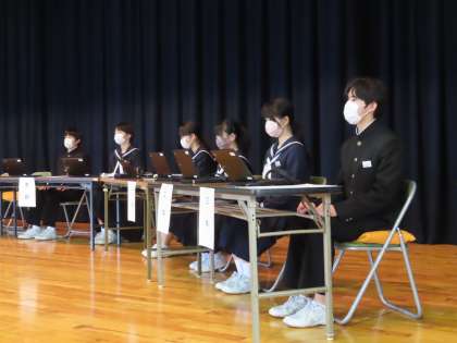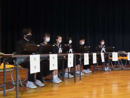 久しぶりに体育館に全校生徒が入って活動が行われました。生徒総会です。間隔を十分に開けて座って始まりました。専門委員長・生徒会・学年委員長は舞台上です。
