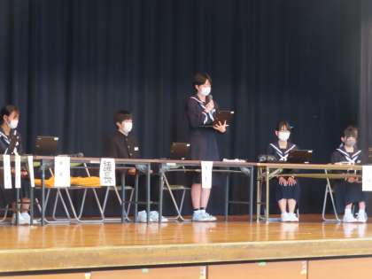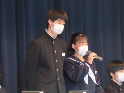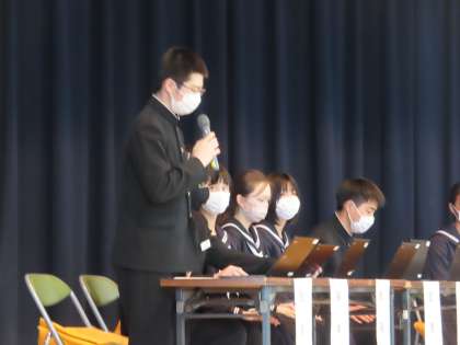 今回の議長は長田さんと白井さんです。よろしくお願いします。第一号議案「生徒会本部と各専門委員長の活動方針」の説明です。