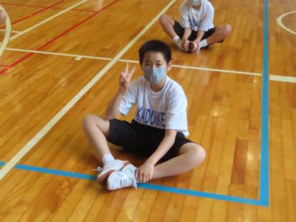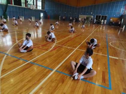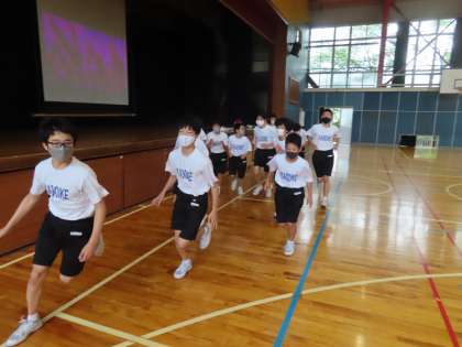 2Cは体育館で体育の授業です。授業初めはラジオ体操とストレッチランニングです。小学校とは違う体育の授業を見ていただきました。ストレッチを見てみると、体が硬い生徒が多いように感じました。日頃からしっかり変え仇のケアをしておきましょう。
