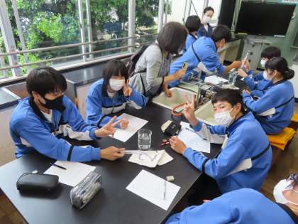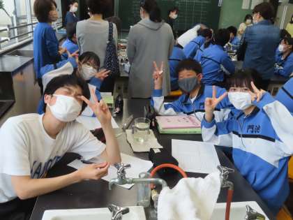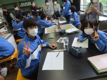 理科室で実験をしていました。保護者のみなさんも近くで観察ができています。親子で実験予想をしている様子も見られました。仲がよいです。