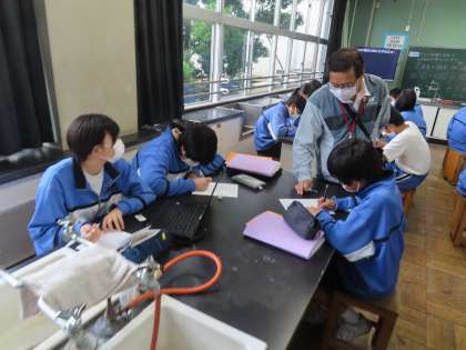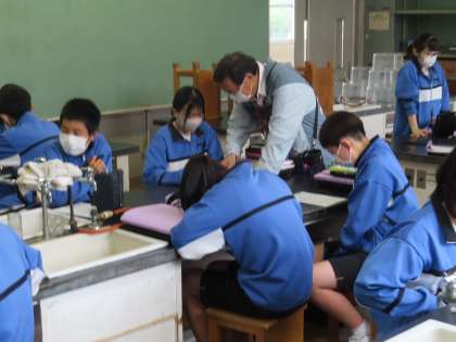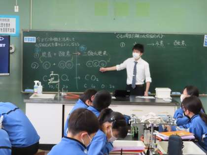 2Aは理科の授業です。「水の電気分解の化学反応」について化学反応式をかけるように学習を進めていきます。記号になると一気に難しく見えてきます。小島支援員さんにも教えてもらっています。