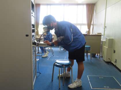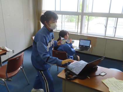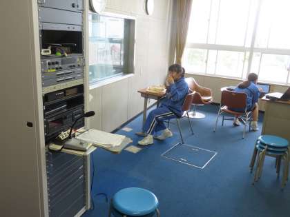 昼の放送の様子です。体育委員会がタータンコートを使う学年の連絡をしています。山田さんと高嶋さんは情報委員です。
