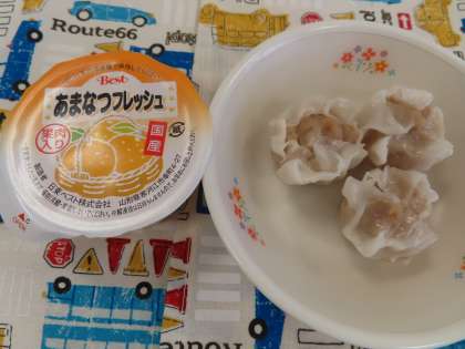 ごはんの上に中華丼の具をのせて食べると、最高においしかったです。シュウマイも具がたっぷり入っていました。とてもおいしくいただきました。ごちそうさまでした。ゼリーには、果肉がたくさん入っていました。