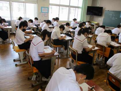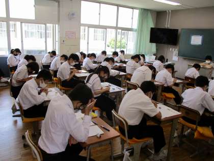 本日は技能教科の期末テスト日です。1年生は音楽、2年生は美術、3年生は技術・家庭のテストに取り組みました。これまでの学習の成果が発揮されることを願います。I組は英語の授業に取り組みました。