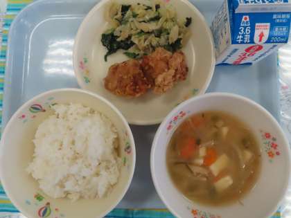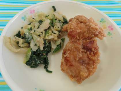 カリッと揚がった鶏の唐揚げでした。べちゃっとする事なくおいしくいただきました。ゴマ和えは口の中をさっぱりとすることができます。ごちそうさまでした。