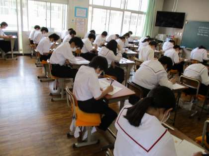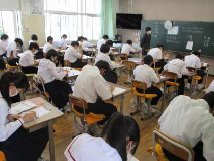 今日は技能教科の期末テスト日です。1年生は音楽 2年生は美術、3年生は技術・家庭のテストに取り組みました。これまでの学習の成果が発揮されることを願います。I組は英語の授業に取り組みました。