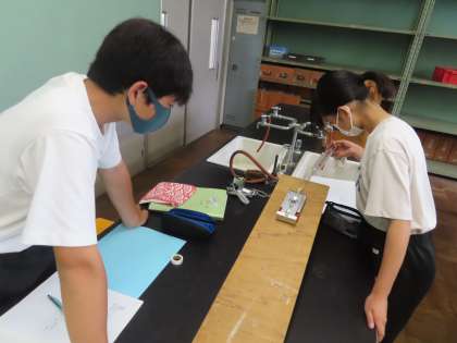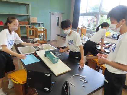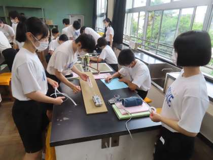 台車を使った実験をしていました。斜面を下る台車の運動はどのような運動なのかを知るために、速度を測る装置を使って実験していました。力を合わせて実験に取り組んでいました。