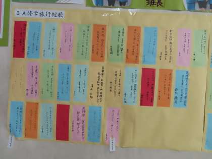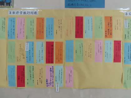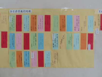修学旅行の様子を短歌にしました。京都、奈良、新幹線やホテルなど気持ちがこもった短歌が多く掲載されていました。