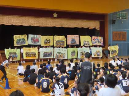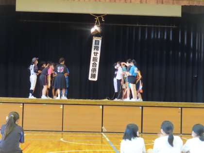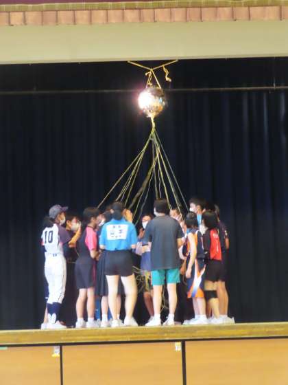 各部活動の意気込みが書いてある模造紙、優勝の文字が入ったくす玉です。