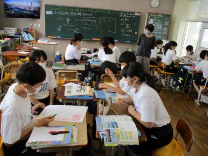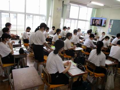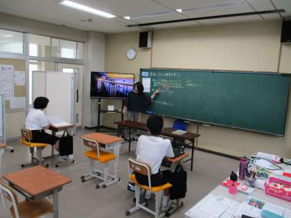 3年生は道徳の授業で杉原千畝さんの功績から自分事に捉えて考えていました。2年生はスポーツテストのハンドボール投げの練習、社会の北九州工業地域について学習していました。1年生は、英語はスピーキングの練習、音楽ではアルトリコーダー、技術では家の設計について学習していました。I組は数学と家庭科の学習に取り組んでいました。