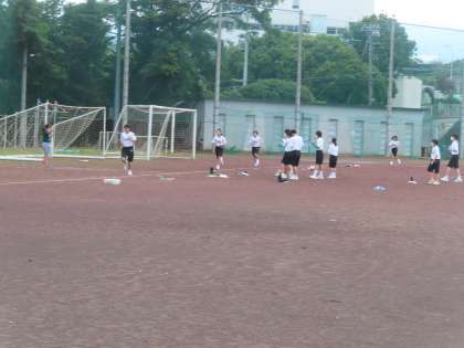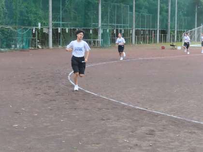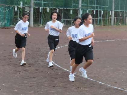 女子が1000mを走っているところです。マスクを外し走っていました。熱中症指数は「28」気温は「26度」でした。水分をたくさん取りましょう。男子がペアになって、あと何周!と声かけをしています。