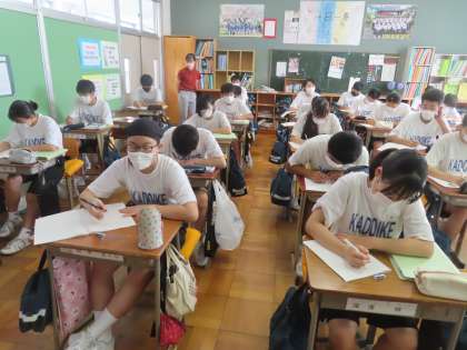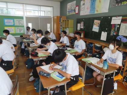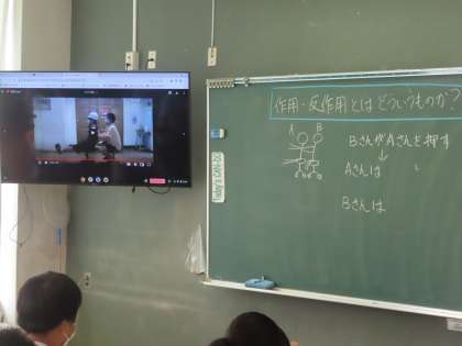 動画視聴です。「作用反作用とはどんなものか」椅子に乗った2人のうち、一人が背中を押すと・・・まず個で考えています。