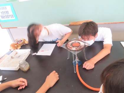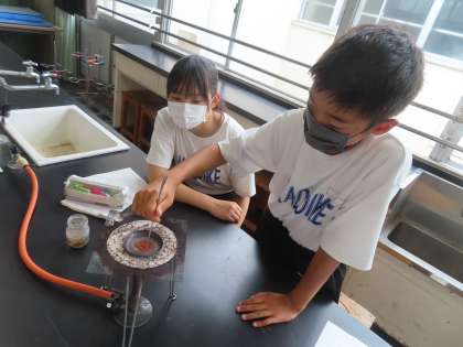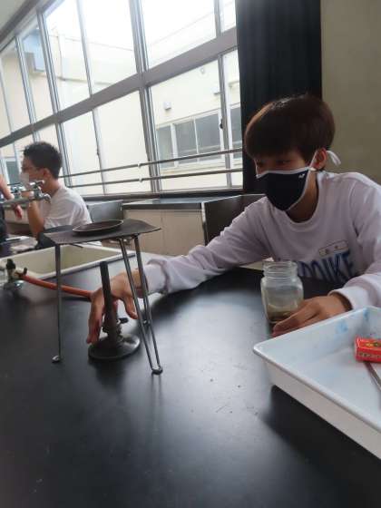 実験です。銅の粉末を熱してどのような変化があるかを確認していました。バーナーで熱しながらかき混ぜたり、観察しメモをとったりしていきました。炎が揺らがないように、窓を閉めての実験だったので汗が出てきました。