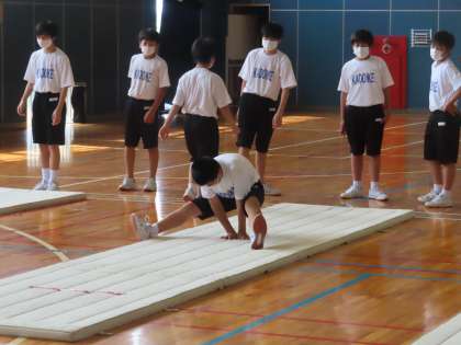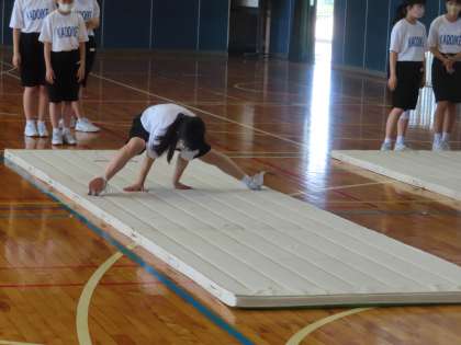 体育館でマット運動を行っていました。開脚前転を中心に練習をしています。