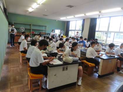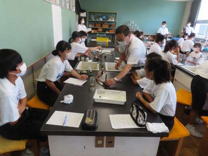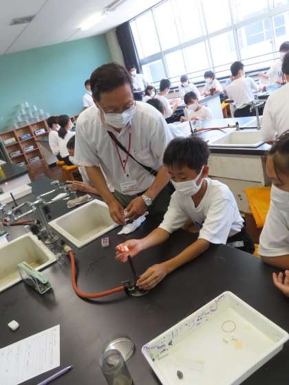 理科の実験の様子です。1Bの実験に小島支援員も参加してくださいました。