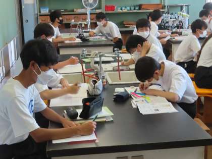 理科室にはエアコンがありません。扇風機があるだけです。同じように特別教室にはエアコンがありません。そこでしかできない実験など、暑くて申し訳ありませんが汗を流しながら授業を行う先生、受ける生徒頑張っています。