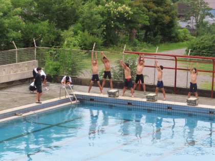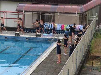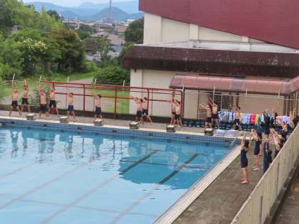 午前中は雨が降っていませんでした。プールサイドで体操をして諸注意を聞いてから入水です。プールサイドは広くないですが、話し声をしないように注意していきます。