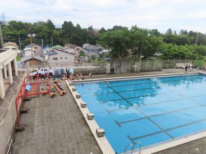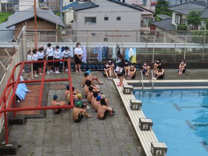 反対のプールサイドには、他学年の集団がいます。なるべく距離が近くならないように工夫をしていました。