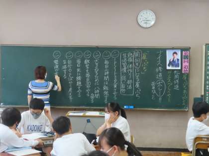 2Cは近藤先生が授業をして行きます。松岡修造さんの話です。自分の苦手なことを褒めていき、自分を盛り上げていく。そうするとできなかったことができるようになる。そんな体験をした松岡さんの実体験です。自分に当てはめてみます。