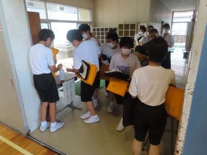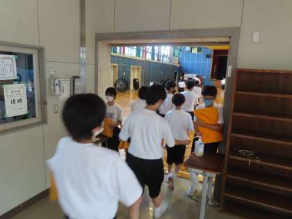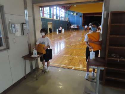生徒会選挙のために体育館に入場する生徒たちに、率先して3年生が消毒をしてくれました。