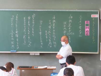 3Bは時田先生の道徳です。「三十点の金メダル」レスリングの金メダリストの伊調選手の話でした。