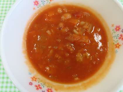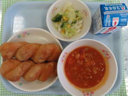 トマトの味がしっかり残ったポークビーンズでした。インゲン豆がたくさん入っていました。きなこパンはまだ温かい状態でやわらかかったです。ごちそうさまでした。