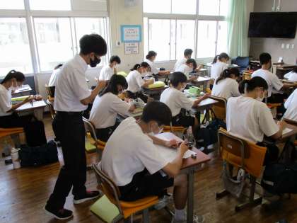 3年生の理科は先日の実験結果を撮影した映像を見合うなど、タブレットを活用した授業を行っていました。他のクラスも暑い中、熱中症に気をつけながら走ったり泳いだり、涼しい部屋で指折り数えながら短歌を考えたり、地図の色つけ作業を行ったり、仲間で教え合い学習にに取り組んだりしていました。