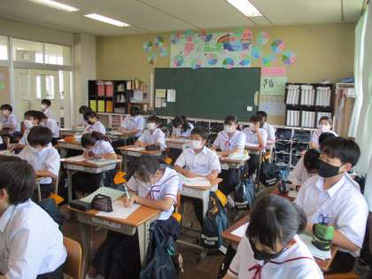 3年生の理科は先日の実験結果を撮影した映像を見合うなど、タブレットを活用した授業を行っていました。他のクラスも暑い中、熱中症に気をつけながら走ったり泳いだり、涼しい部屋で指折り数えながら短歌を考えたり、地図の色つけ作業を行ったり、仲間で教え合い学習にに取り組んだりしていました。