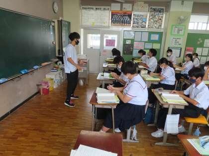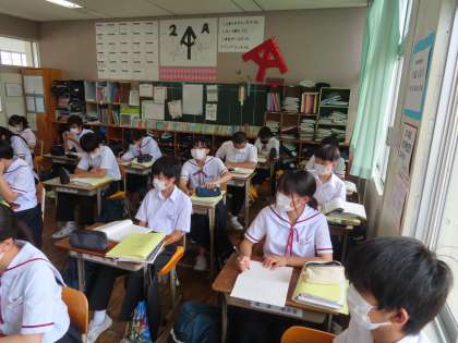短歌の学習に入っていきますが、夏休みの宿題についての説明があります。短歌が記入されているプリントが2枚、このテストを休み明けにやります。夏休みのワークと感想文(人権・平和・読書)の中から一つ選択するそうです。忘れずにやってこよう!