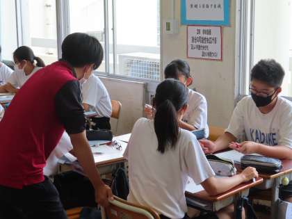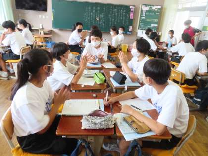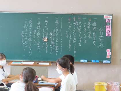 2Bは青山先生の道徳です。2年生は共通の題名「私は十四歳」という話です。現在の部活動や好きでやっていること、楽しい面と苦しい面とがある。自分を高めていくためには、どんな意志が必要なのだろう・・・そんな意見交換をしていきます。