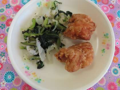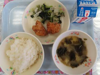 からっと揚がったサクサクの唐揚げでした。ゆかり和えがさっぱりとしてくれ、失いがちの塩分も補給してくれます。大きなジャガイモがたくさん入った味噌汁もおいしかったです。ごちそうさまでした。
