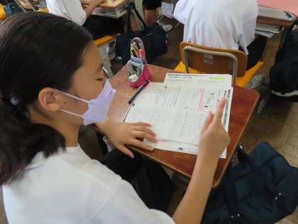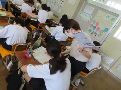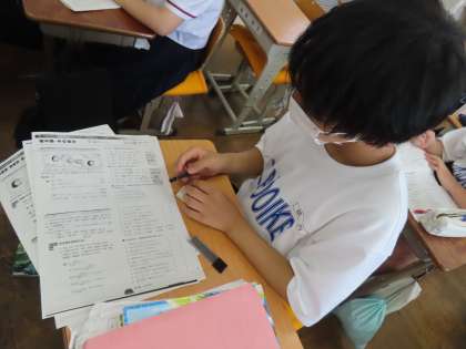 竹内先生の国語です。今日はプリントを中心に進めていました。連文節・文の成分というプリントです。机間巡視をしながらヒントを出していきます。