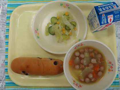 ウインナーがたっぷり入ったポトフでした。豚肉のポトフが多かったですがウインナーもおいしかったです。レーズンがたっぷり入ったロールパンです。甘酸っぱくておいしさが口に広がります。ごちそうさまでした。