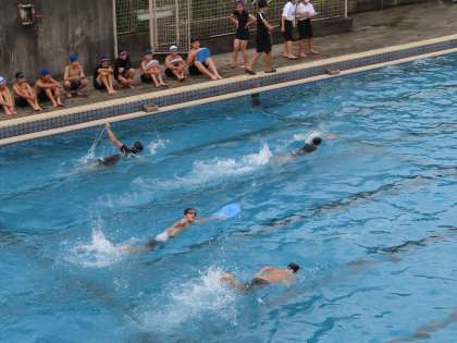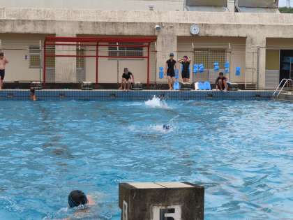 水泳のタイム計測をしていました。クロール(自由形)です。ビート板を使っている生徒もいました。足をつけないで泳げるとよいのですが・・・