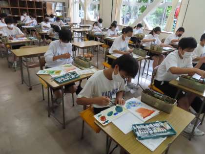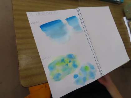 美術では、表現の幅を広げるための技法を身につける。という学習課題です。「ぼかし」「にじみ」について色の組み合わせも考えてチャレンジしていました。