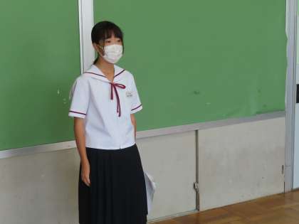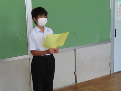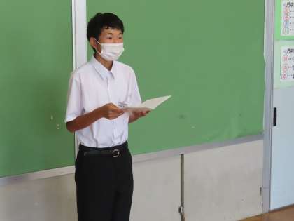 2学期の抱負を各学年の代表者が語ってくれました。1年生は庄司敬楽さん、2年生は加藤颯人さん、3年生は栃山瑞葵さんです。生活面、学習面、部活動面、そして3年生は進路関係の決意を語ってくれました。
