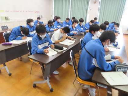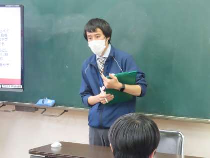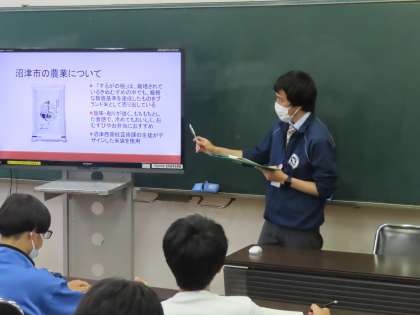 会議室での講話です。農林農地課の深澤さんが「地産地消運動について」の講話をしてくださいました。食の安全・安心や食育などの取り組みについてお話をいただきました。